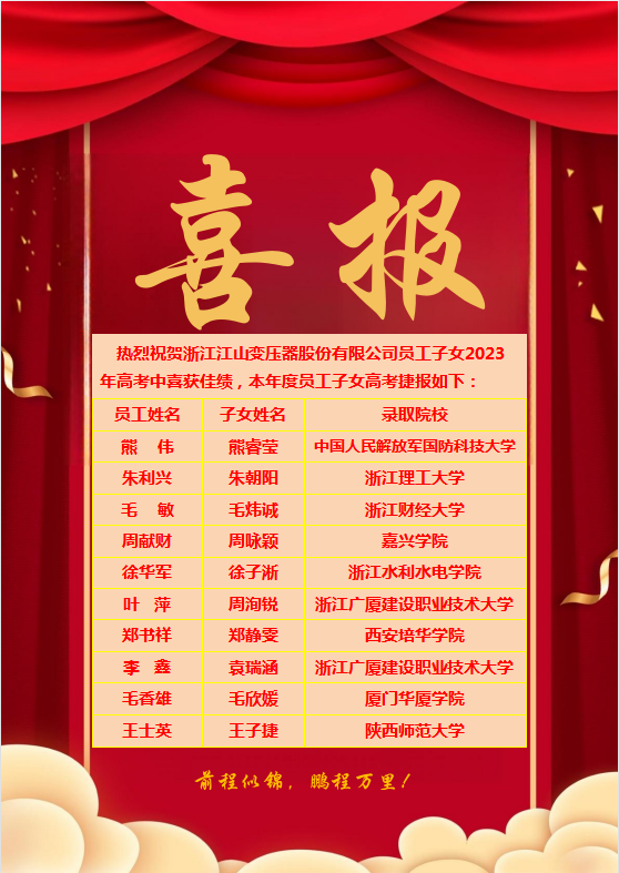 2023年8月16日下午,浙江江山變壓器股份有限公司隆重舉行了員工子女2023年高考表彰大會,對2023年參加高考并順利被大學(xué)錄取的10名員工子女進行表彰,公司主要領(lǐng)導(dǎo)及員工、員工子女一同出席會議。